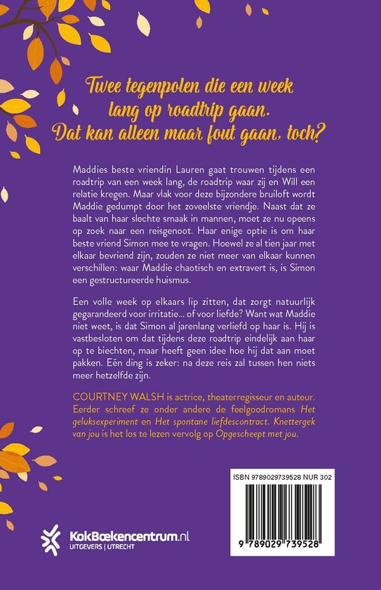 ‘Knettergek van jou’ is een feelgoodroman van Courtney Walsh over een wel heel bijzondere roadtrip… Maddie Rogers en Simon Collier zijn in alles het tegenovergestelde van elkaar. Waar Maddie een enorme chaoot is die geniet van karaokeavonden en al heel wat vriendjes heeft gehad, is Simon een echte huismus die de inhoud van zijn koelkast graag op alfabetische volgorde sorteert en zich het liefst op de achtergrond houdt. Toch zijn de twee al jaren beste vrienden.
