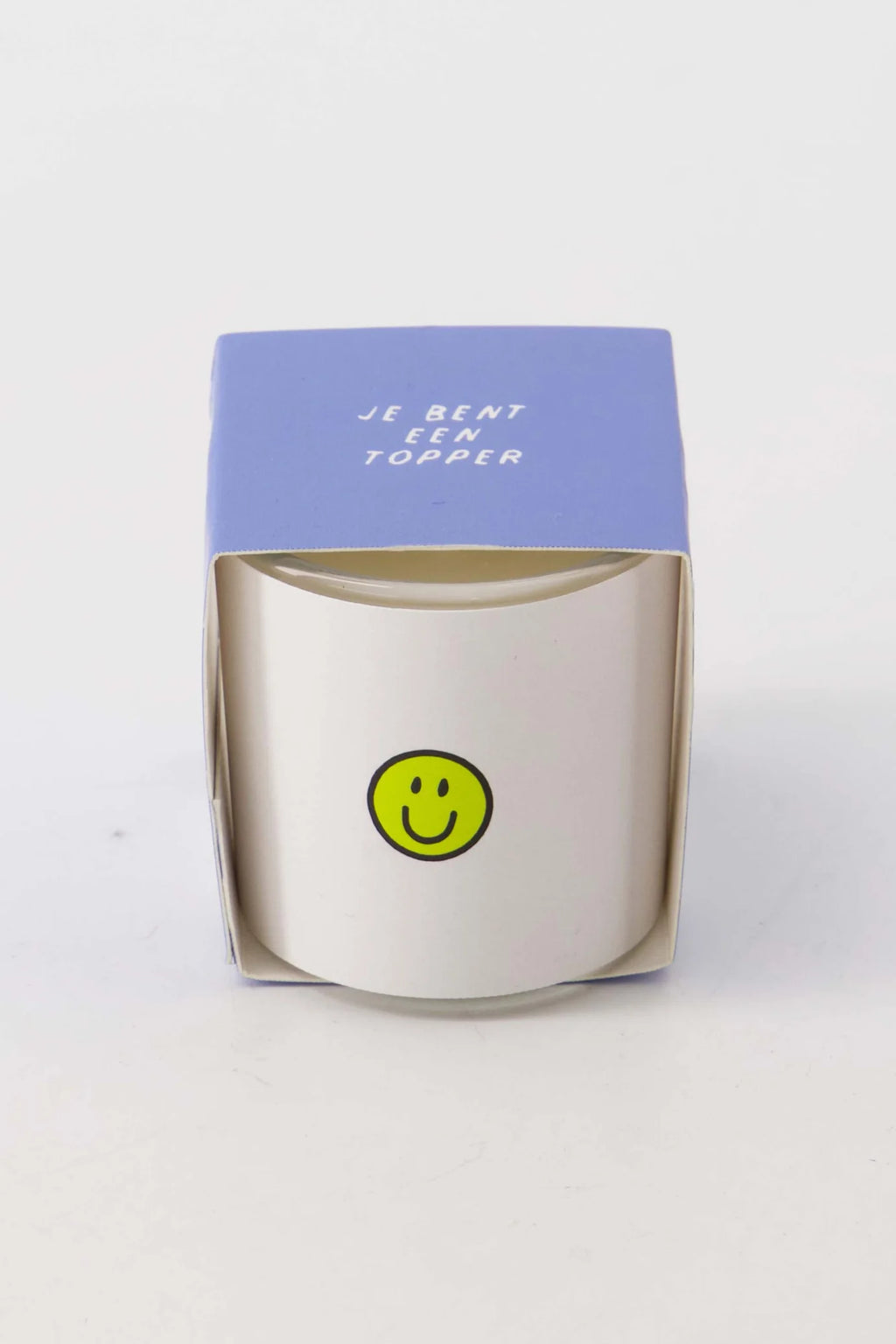 Dit Zusss geurkaarsje met topper is perfect voor wie sfeer en warmte wil toevoegen in huis. Het geurkaarsje straalt een gezellige uitstraling uit, door de witte kleur met een vrolijke smiley op de voorkant en een blauwe wikkel met de tekst 'Je bent een topper'. Het geurkaarsje past mooi in de woonkamer en is een subtiel maar persoonlijk detail. Geniet van de warme glow en de fijne geur die dit Zusss geurkaarsje met topper verspreidt.