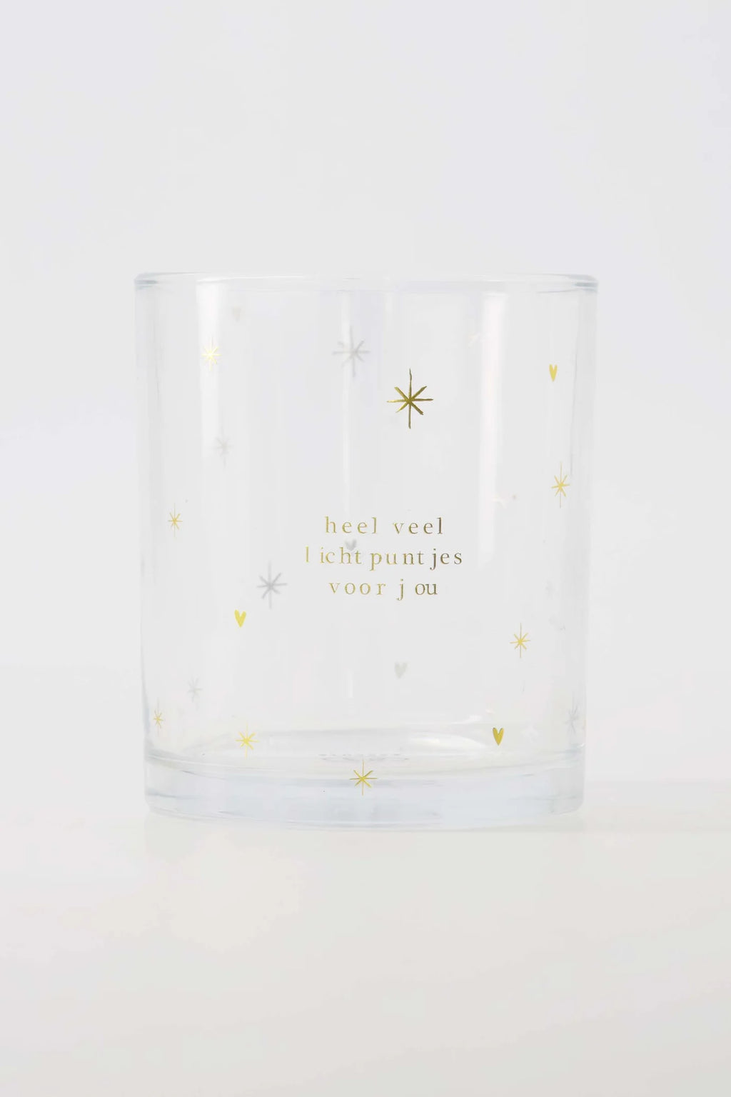 Deze Zusss waxinelichthouder glas met sterren brengt warmte in huis met een subtiel goudkleurig sterrentjespatroon. De transparante kleur laat het licht zacht schitteren en creëert een fijne ambiance. Op het glas staat de lieve tekst "heel veel lichtpuntjes voor jou" which maakt het extra speciaal. Perfect voor een gezellige avond of om cadeau te geven. De waxinelichthouder glas voegt een warm tintje toe aan elk interieur.