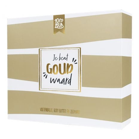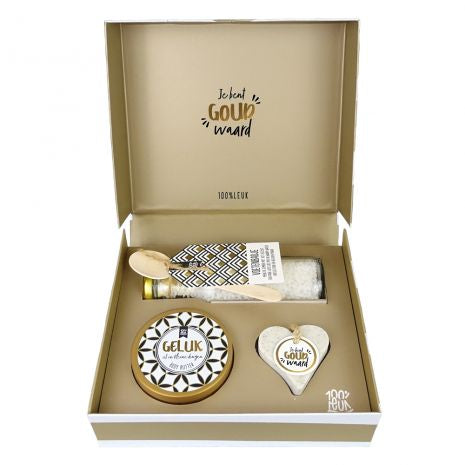 Wat geef je iemand die veel voor je betekent? Dit pakket is dan een waardevolle attentie om te laten weten dat ze goud waard is! Even in de relax met het populaire product uit de collectie, namelijk het voetenbadje. Gecombineerd met een bodybutter en een zeephart geef je een mooi pakket! Het pakket is gemaakt van stevig karton, zodat de producten in de doos mooi blijven als je het pakket wilt opsturen.