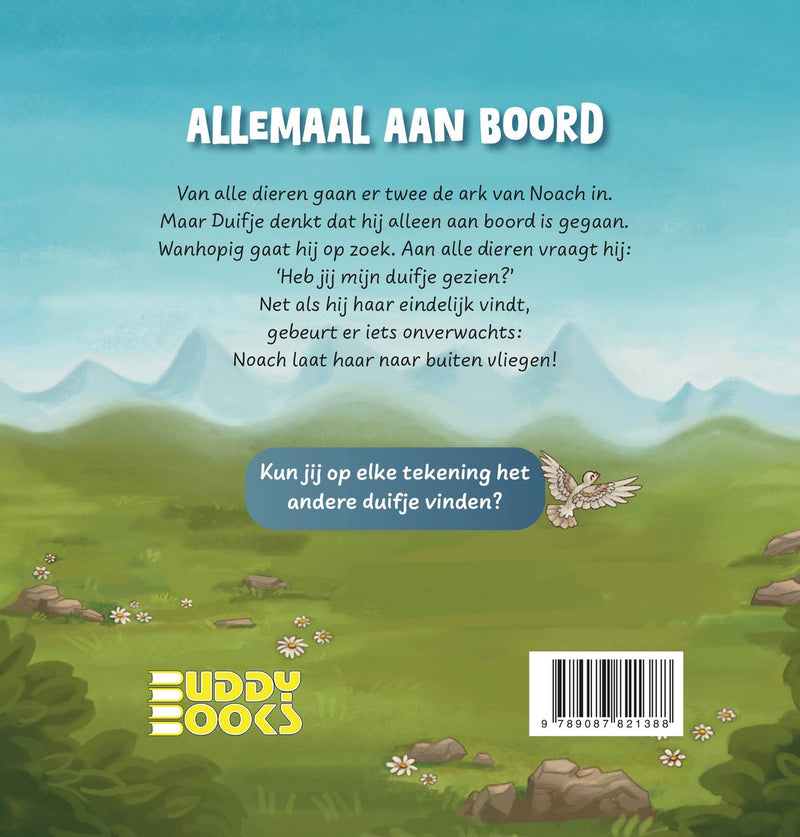 Van alle dieren gaan er twee de ark van Noach in. Maar Duifje denkt dat hij alleen aan boord is gegaan. Wanhopig gaat hij op zoek. Aan alle dieren vraagt hij: “Heb jij mijn duifje gezien?” Net als hij haar eindelijk vindt… gebeurt er iets onverwachts: Noach laat haar naar buiten vliegen! Kinderen kunnen het duifje helpen door mee te zoeken, want het andere duifje zit verstopt in iedere tekening. De tekst is op rijm geschreven, wat het voorlezen extra fijn maakt. Over de illustrator: Allemaal aan boord is het sprankelende prentenboekdebuut van Christel Driesse, dat zij illustreerde tijdens haar stage bij uitgeverij Buddy Books. Met haar frisse stijl en oog voor detail weet ze het verhaal op elke pagina tot leven te wekken.