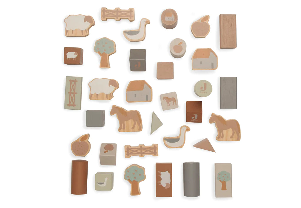 Bouwen maar! Deze leuke houten blokkenset bevat 34 blokjes in verschillende vormen. Je kindje kan zijn of haar fantasie kwijt met al de verschillende bouwmogelijkheden. Super leuk om samen mee te spelen of alleen. De blokjes hebben verschillende vormen en kleuren. Ook zitten er diertjes bij. Maak je een kinderboerderij, een hoge toren of een huis? De mogelijkheden zijn eindeloos met deze leuke blokkenset. De blokken worden geleverd in een mooie doos. Ook super leuk om cadeau te geven!