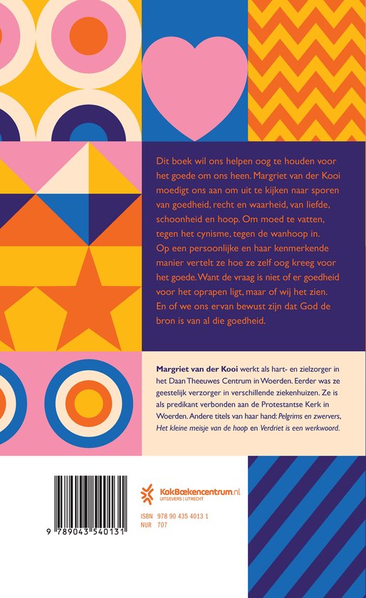 Goedheid voor het oprapen van Margriet van der Kooi is een positief boek voor deze donkere tijd, met een open blik voor de mooie dingen in de wereld om ons heen. De auteur ontmoet en spreekt veel mensen en heeft de gave om het beste in mensen naar boven te halen. Dit ontroerende boek bemoedigt lezers en helpt ze om oog te blijven hebben voor het licht in de duisternis. Door de fraaie vormgeving is het boek zeer geschikt om cadeau te geven.