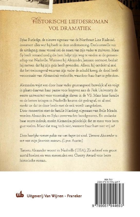 Tamera Alexander woont in Nashville (USA). Ze schreef een groot aantal boeken en won meermalen een Christy Award voor beste historische roman. Dit boek is het derde deel in de Bell Meade serie.