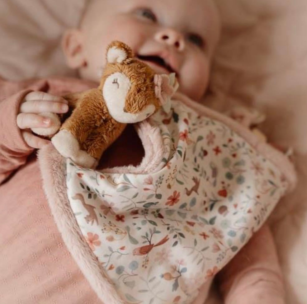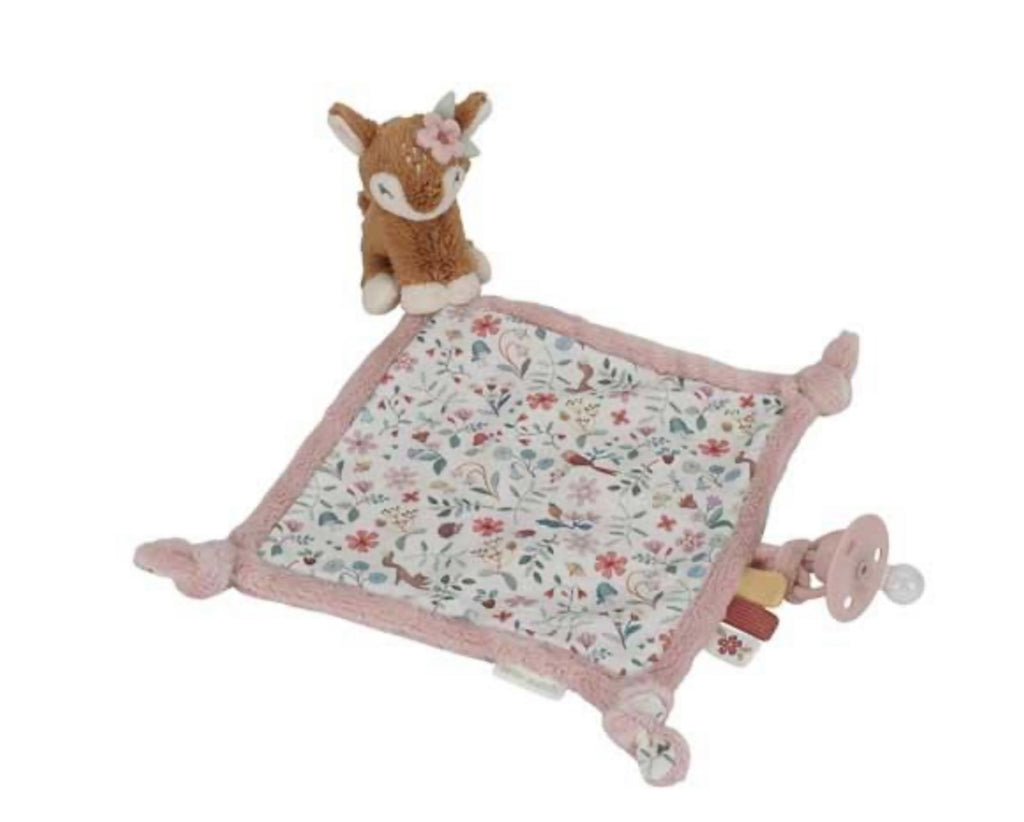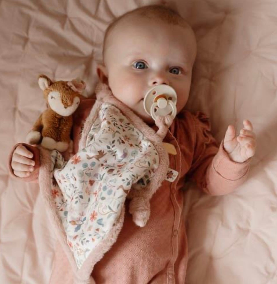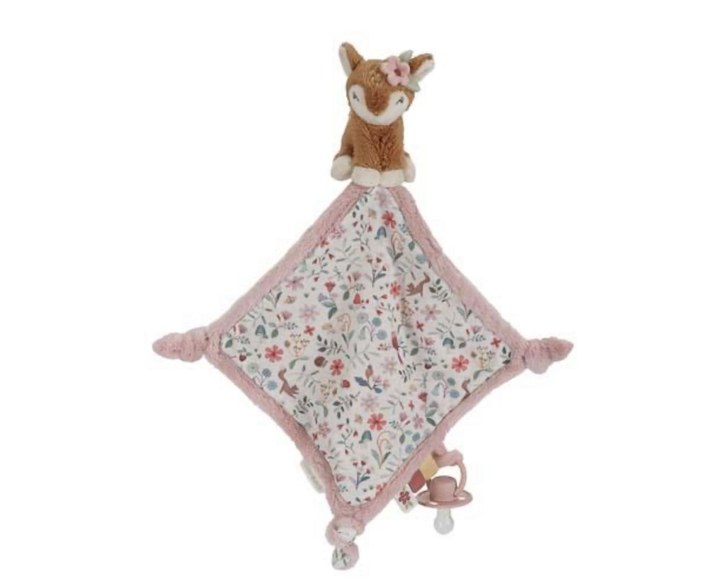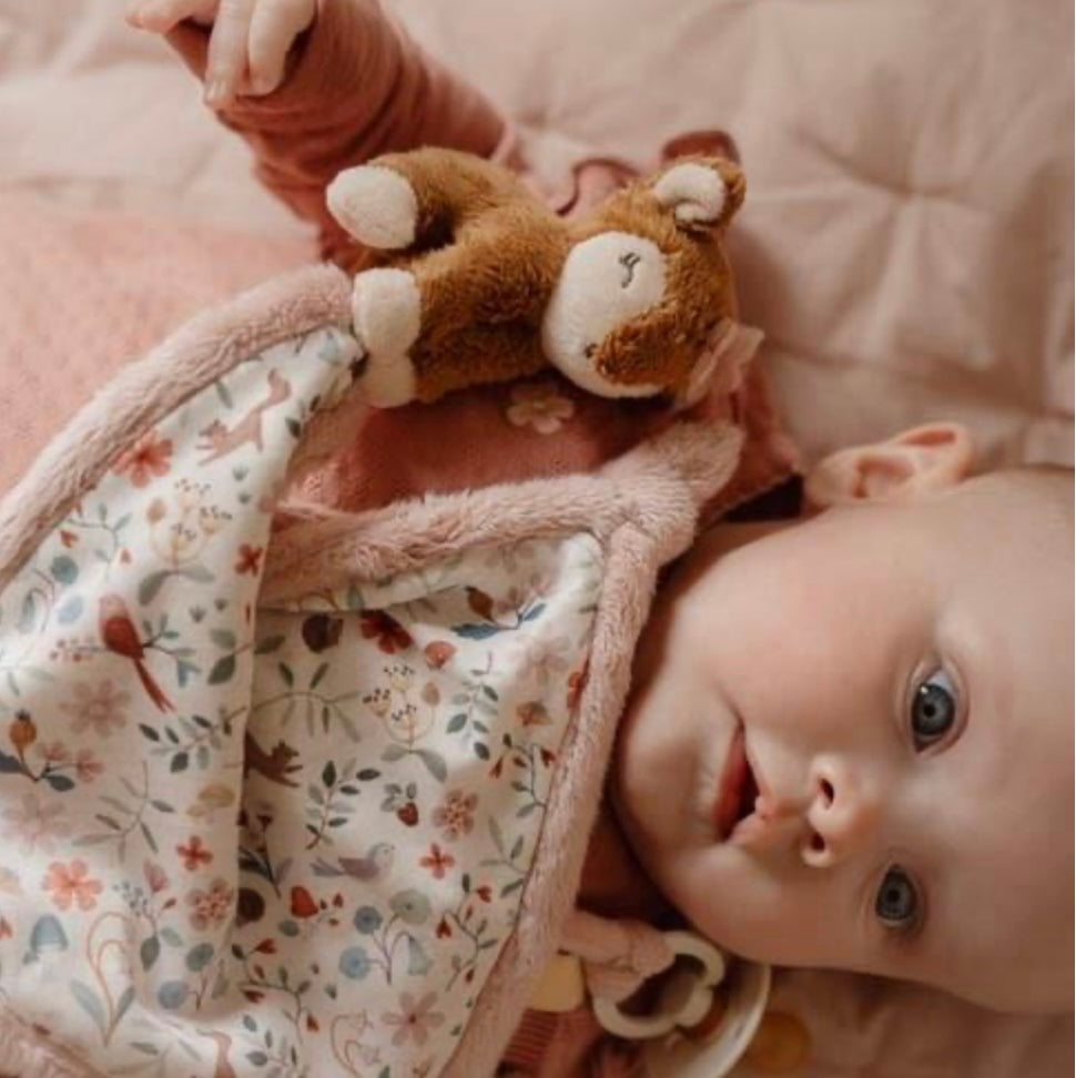Knuffel maar fijn! Zorg ervoor dat dit heerlijk zachte knuffeldoekje altijd binnen handbereik is, voor geruststellende knuffels op elk gewenst moment, waar je ook bent. Versierd met het Fairy Garden dessin, biedt het vele leuke details voor baby’s om te ontdekken. Diverse labels die de zintuigen prikkelen, makkelijk vast te pakken knopen, en een lus om een speen of bijtring aan te bevestigen. Het zachte hertje maakt het doekje extra knuffelig.