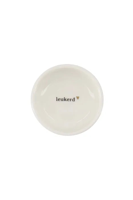 Dit dipschaaltje van Zusss is o-zo handig! Ideaal voor sausjes of om bijvoorbeeld je gebruikte theezakje in te leggen. Dit dipschaaltje is wit van kleur met daarop 'leukerd'. Dit item is gemaakt van aardewerk, heeft een doorsnede van 7,5cm en is 3cm hoog.