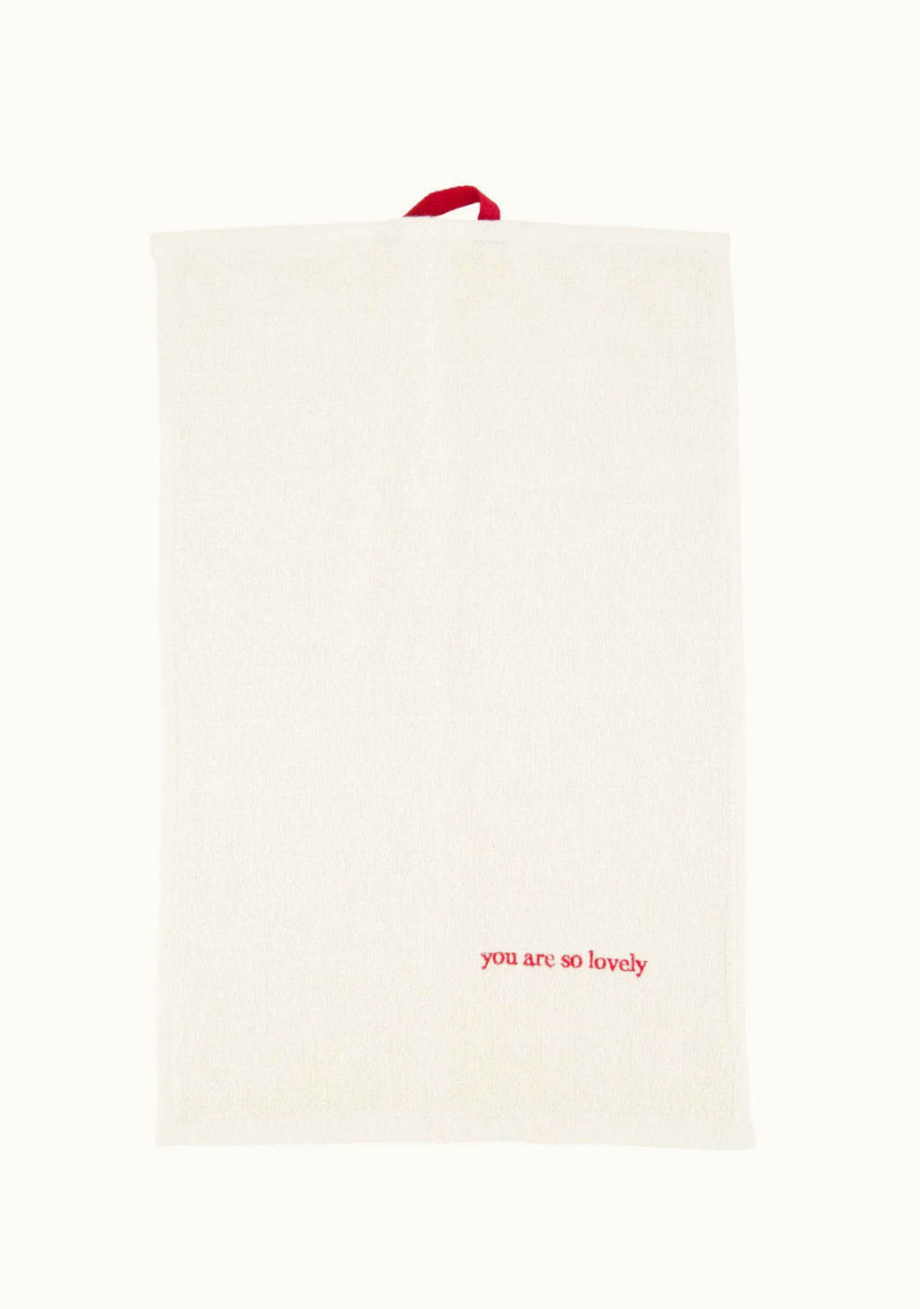 Het Zusss gastendoekje is een warme toevoeging aan je keuken. Dit gastendoekje met de tekst "you are so lovely" in rood op wit, geeft net dat beetje extra sfeer en gezelligheid. Dankzij het zachte materiaal ligt het fijn in gebruik en hangt het door het rode lusje gemakkelijk aan je keukenhaakje. Combineer dit gastendoekje met andere praktische en stijlvolle Zusss accessoires voor een compleet keukenhoekje vol warmte.